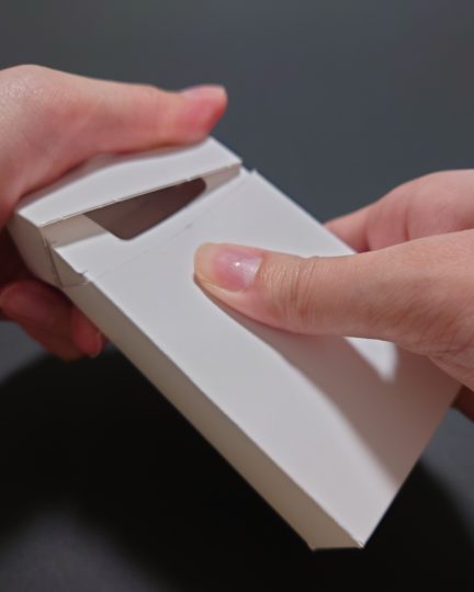 そこで、私たちは簡易的で安価なヒンジリッド型のパッケージを開発しました。この新しいデザインは、使いやすさと機能性を兼ね備えており、特に利便性を重視しています。具体的には、正面に施されたミシン目の中央部分をグッと押し込むことで、パリッとした音と共にミシン目が割れ、簡単に開封できる仕組みになっています。この操作は非常に直感的で誰でも簡単に行えるため、ストレスなく使用できます。